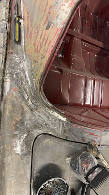 Between the rear body panel and fender I had to cut out a piece due to rust around previous welding. Here I insert a narrow plate in the opening.